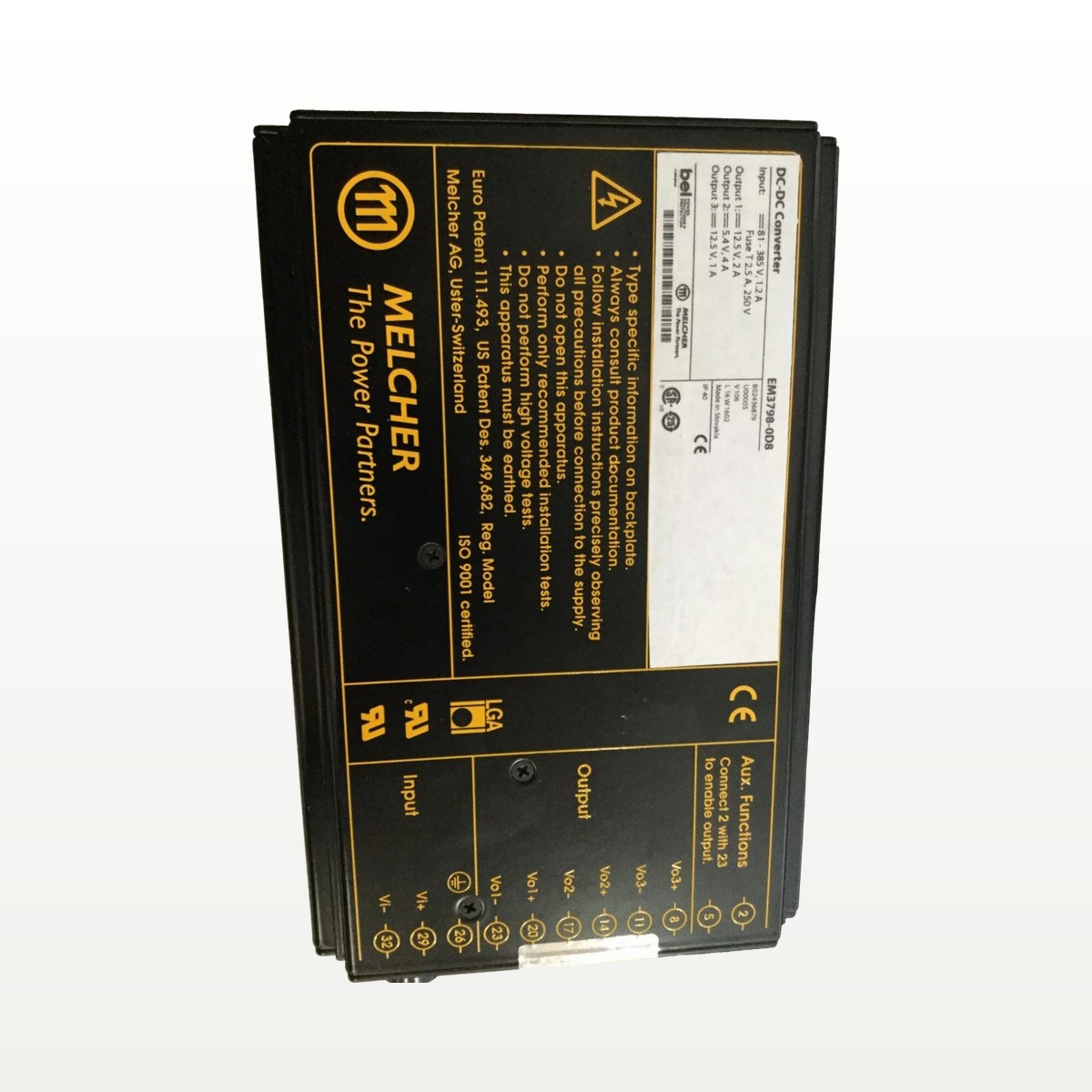 Industrial AC-DC power supply from Melcher’s EM3798 series. Designed for demanding industrial applications requiring reliable power conversion.